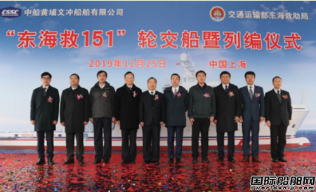12月25日,中船黃埔文沖船舶有限公司為東海救助局建造的“東海救151”輪(H2367)在東海救助局外高橋碼頭順利交付,東海救助局黨組書記高軍、上海船舶研究設計院黨委書記王麟、公司董事長盛紀綱等單位領導和來賓共同出席了交船暨列編儀式。