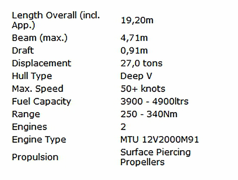 總長: | 19.20m | 航速: | 50kn |