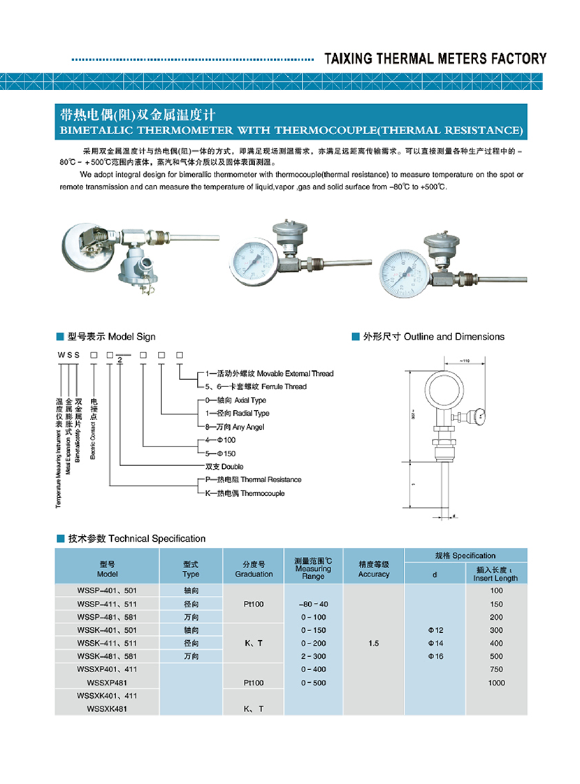 帶熱電偶(阻)雙金屬溫度計(jì) | |||