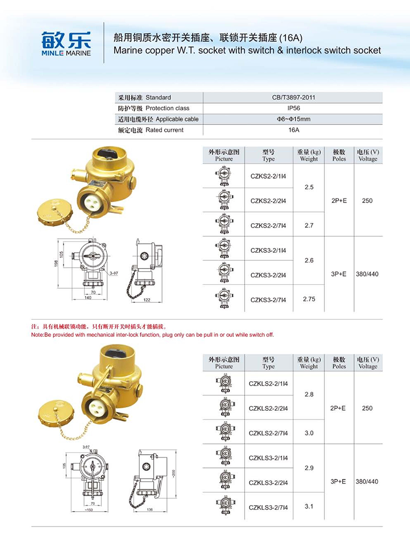 船用銅質(zhì)水密聯(lián)鎖開關(guān)插座(16A) | |||