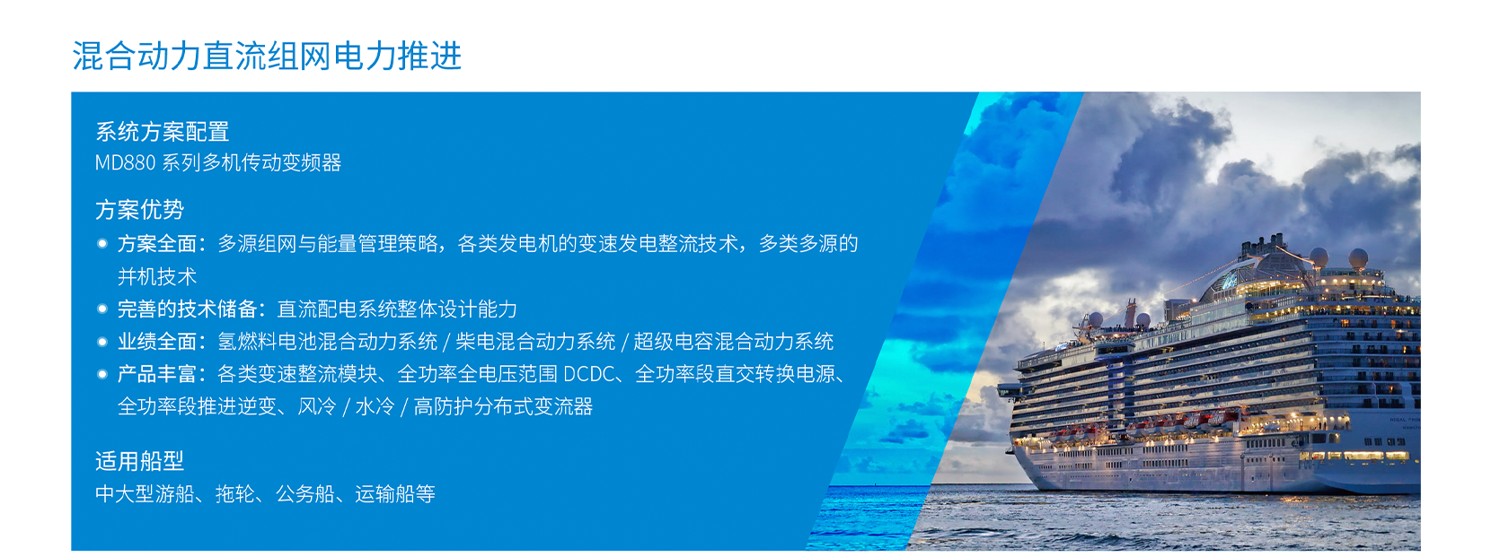 | 適用船型: | 中大型游船;拖輪;公務(wù)船;運(yùn)輸船等 | 方案優(yōu)勢(shì): | 方案全面,各類發(fā)電機(jī)的變速發(fā)電整流技術(shù);多類多源的,并機(jī)技術(shù);直流配電系統(tǒng)整體設(shè)計(jì)能力業(yè)績(jī)案例全面,涵蓋氫燃料電池類/柴電類 / 超級(jí)電容類;產(chǎn)品豐富 |